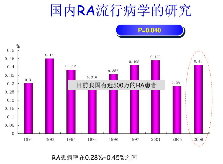 美日患病率分别为3.0%和0.3%,我国RA患病率在0.28~0.45之间,目前我国有近500万的RA患者,类风湿关节炎致残率79.4%。
